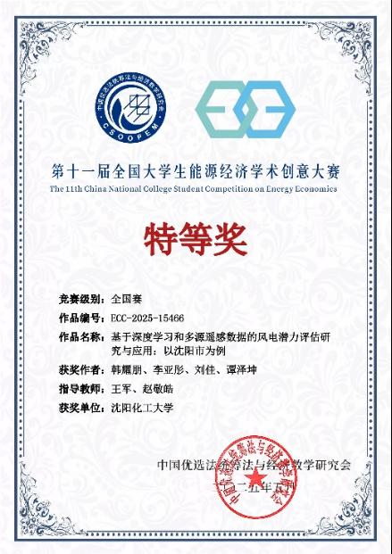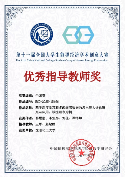 第十一届全国大学生能源经济学术创意大赛总决赛在5 月 24 日至 25 日举行。我校研究生韩耀鹏等学生的作品《基于深度学习和多源遥感数据的风电潜力评估研究与应用:以沈阳市为例》成功进入终审决赛,在激烈角逐中最终斩获全国研究生组特等奖。该作品由我校304永利集团官网入口王军教授和中国科学院青岛生物能源与过程研究所田亚峻研究团队的赵敬皓工程师联合指导,是我校在该大赛中取得的历史最高奖项。